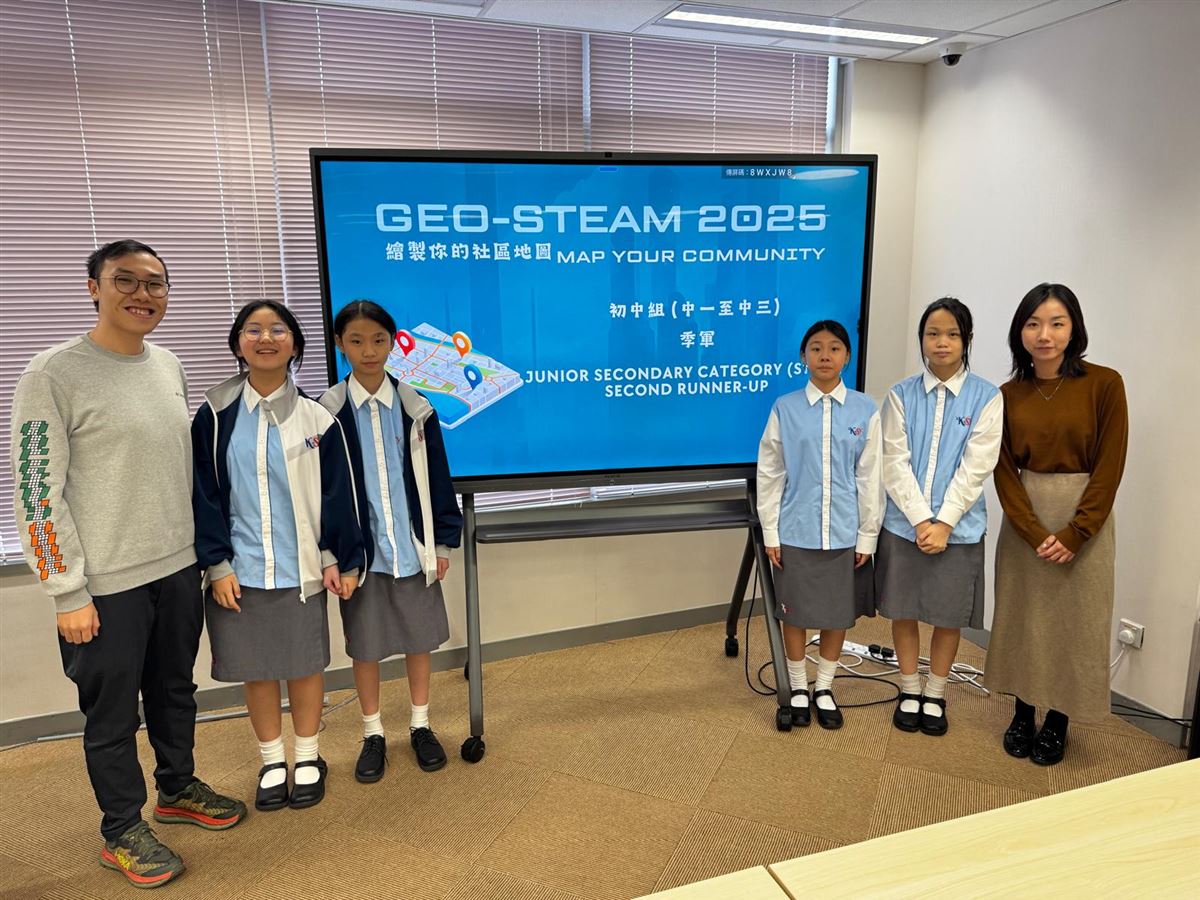 內文描述:四位中一的同學在聖誕節假期前參加了名為「GEO-STEAM 2025」工作坊及比賽,同學們以「花墟重建計劃」為主題探討重建局規劃地區發展時不同的考慮因素,再利用GIS的技術分析油尖旺區樓宇樓齡的分佈,加上同學匯報表現淡定,結果獲得評判們的肯定及掌聲,最後勇奪季軍的獎項。